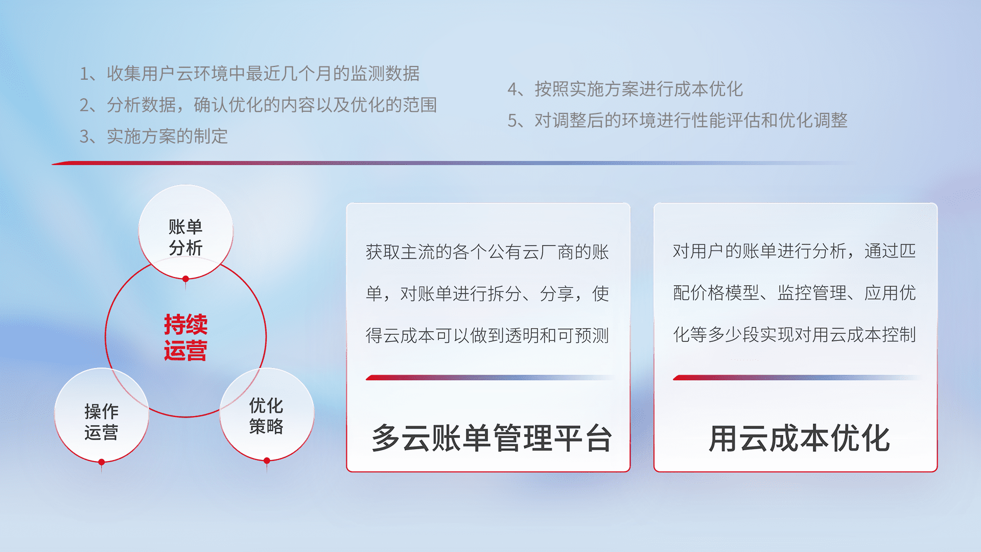 通过灵活运用多种自动化迁移工具,,帮助企业用户实现业务和数据高效 、、、、稳定的上云迁移和云上迁移,,,,采用自研多云纳管平台,,,,以中立管理模式,,,,解决多组织、、多云、、多运维厂商的复杂关系的管理,,保证多云平台资源配置的一致性,,实时掌控云资源运行数据,,运用智能化工具分析云资源多云平台的管理服务,,,,透明化管理成本支出,,用云成本可预测、、、、用云费用可优化、、云资源配额有据可依。。。