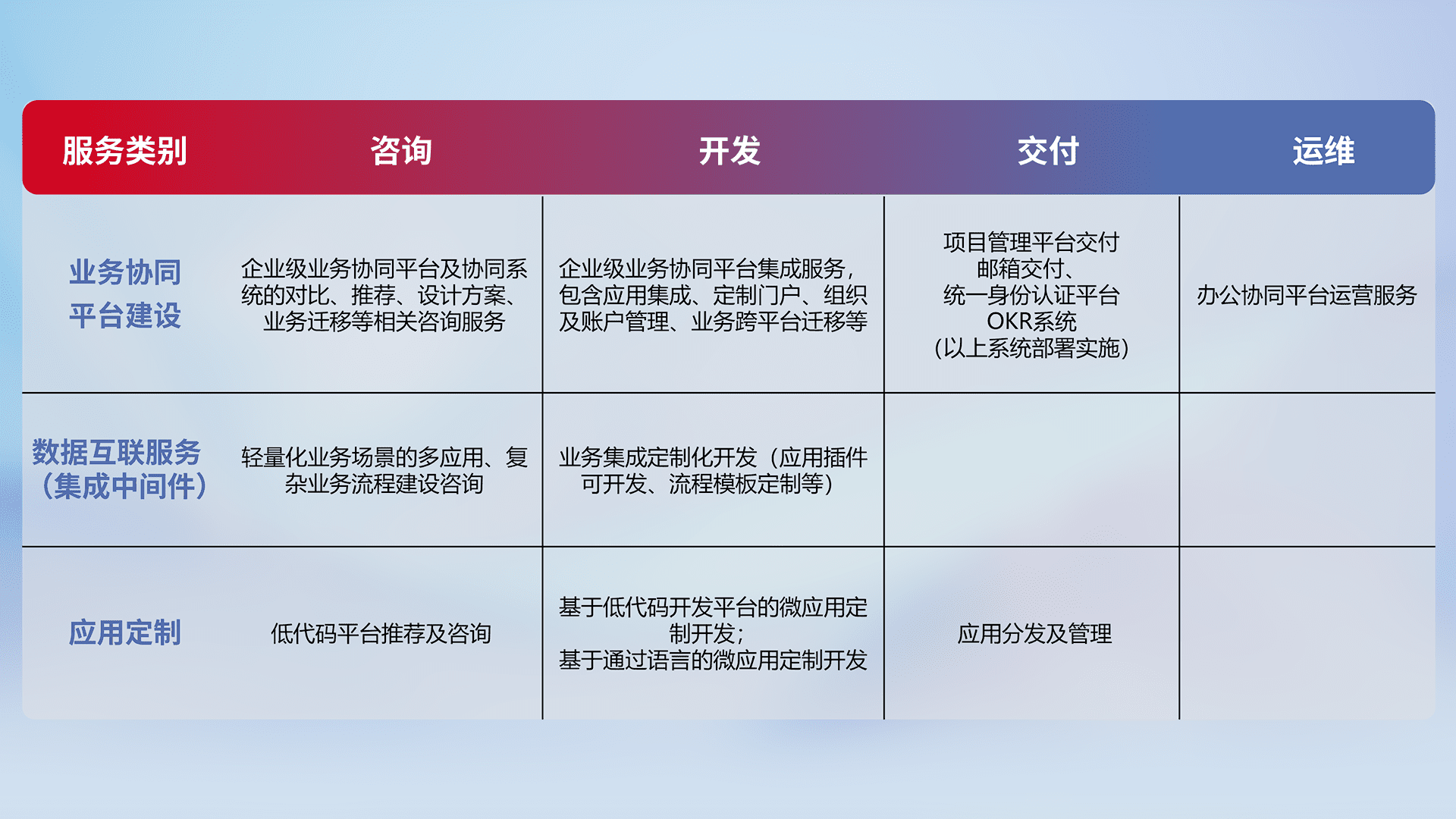 针对钉钉、、、、企微、、IDaas等平台级产品提供产品的规划、、、、方案、、、交付、、、定制化开发等服务,,实现如统一协同办公、、、、智能客户服务、、、混合会议管理、、智能数据查询、、等业务场景,,实现数字化转型。。